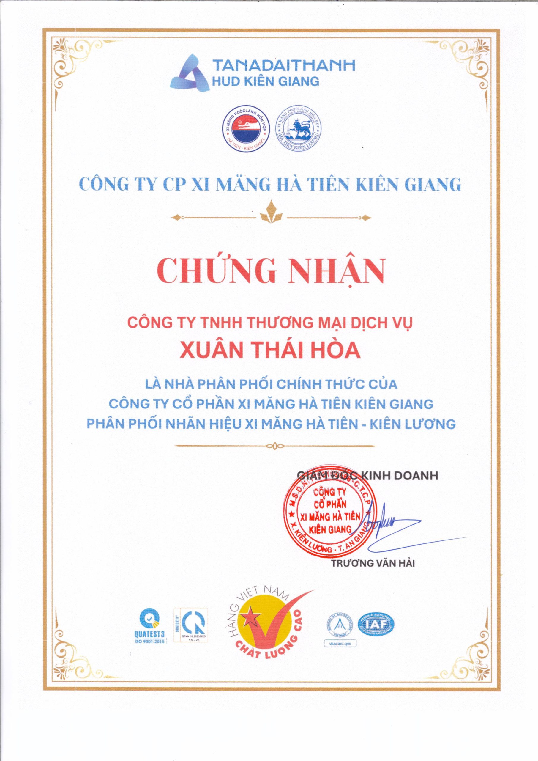 CHỨNG NHẬN NHÀ PHÂN PHỐI HÀ TIÊN KIÊN GIANG